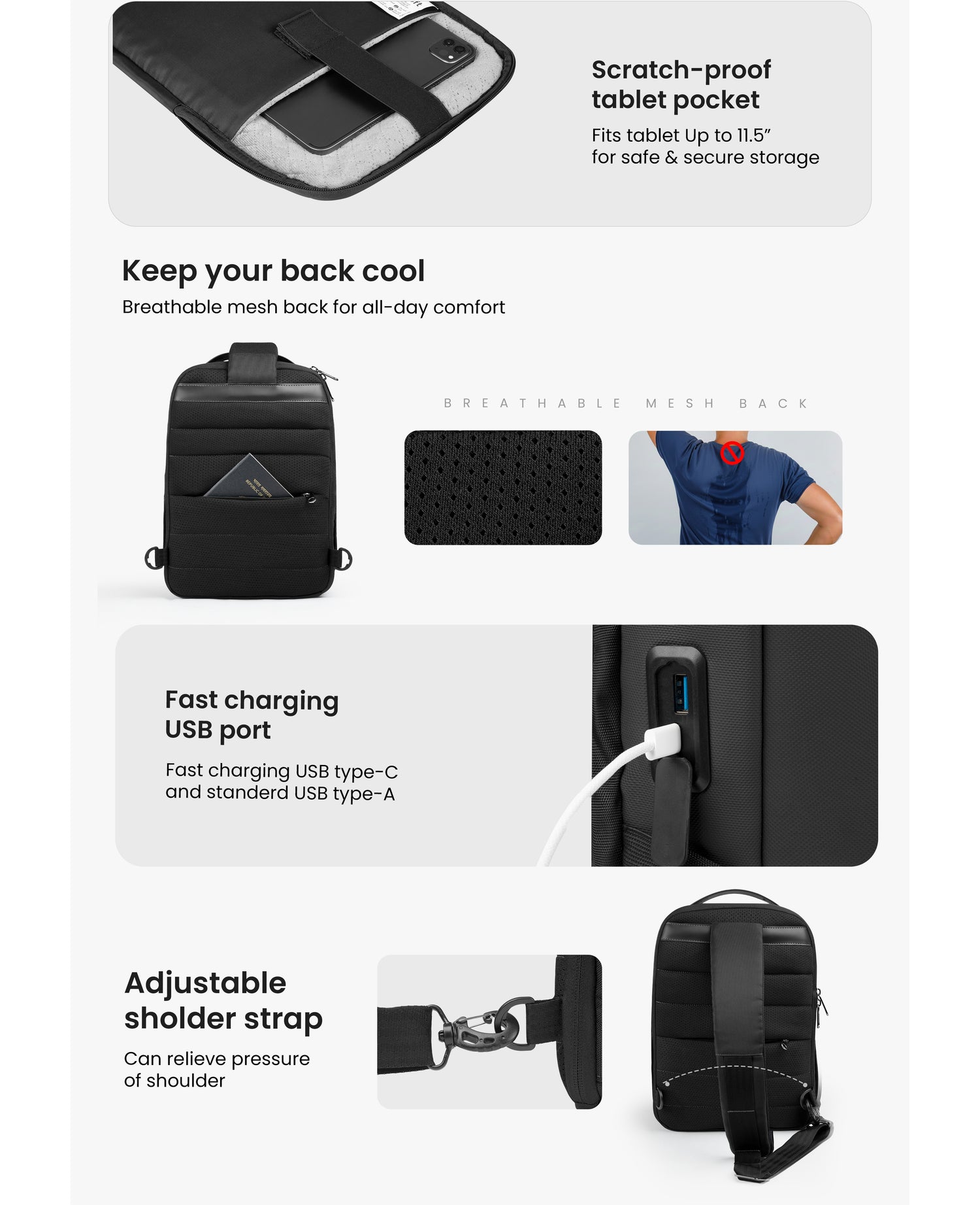 - Breathable Back Panel + PVC Grab Handle for Daily Comfort
